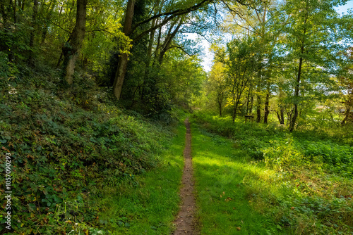 path through a forest with trees and bushes. The path is lined with green grass and leaves