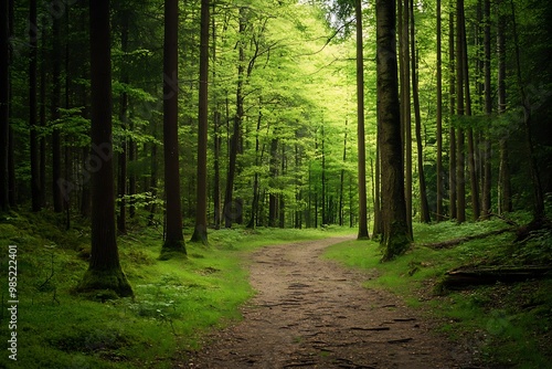 Path Through Lush Green Forest with Sunlight Filtering Through Trees