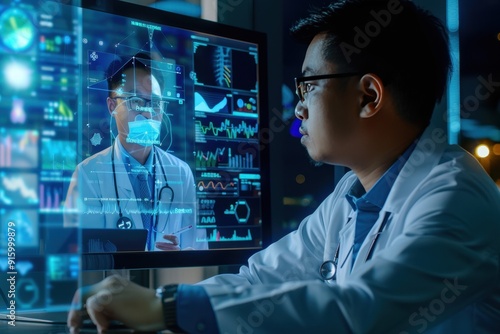 Patient engaging in a futuristic virtual doctor's consultation via computer screen