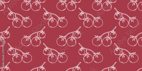 Pattern featuring stylized tomato illustrations on a deep red background for design use