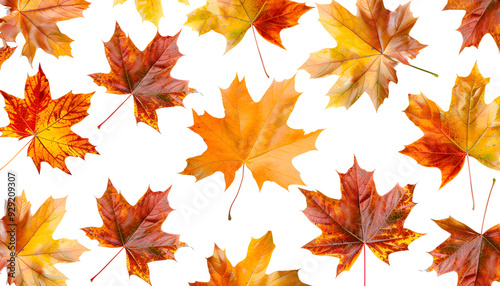 pattern of colorful autumn maple leaves with hard light isolated on white background. Warm colors of Autumn