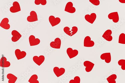 Pattern of red paper hearts and one broken heart among them on the biege background