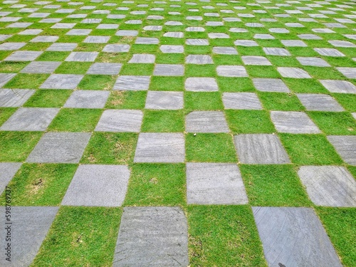 Pattern of square cement floor tiles with green . walkway with green grass in the park. Stone pathway and green grass at park. Garden Stepping Stone Path through Green Grass Law.
