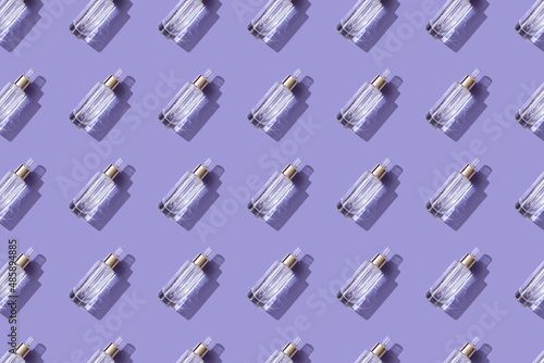 Pattern osmetic product, a beautiful bottle with a pipette on a trendy purple background, sunlight creates shadows and reflections. Demonstrating very peri, color of 2022 year.