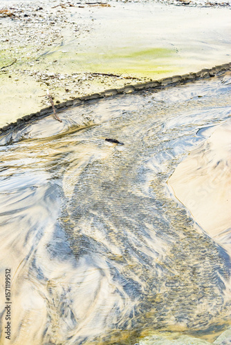 Patterns in wet yellow and black mineral sands on a beach at low tide