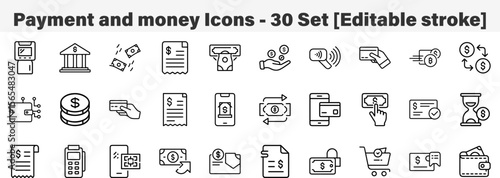 Payment and money Icons 30 Set. Line Art Icon Collection. Editable Stroke. Vector Illustration