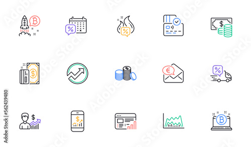 Payment, Business growth and Bitcoin line icons for website, printing. Collection of Discounts calendar, Trade chart, Coins banknote icons. Euro money, Hot offer, Mobile finance web elements. Vector