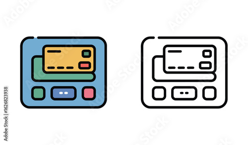 Payment Terminal with Credit Card, Modern Financial Technology Concept, Colorful and Black-White Outline