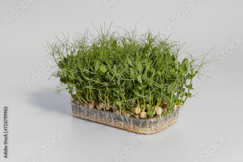pea microgreens for eating a valuable and healthy product the final stage of growth and ready to be cut on a gray background