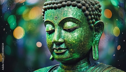 Peaceful Buddha Statue with a Green Patina and Soft Bokeh Lights