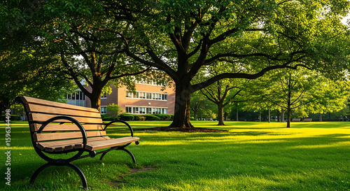 Peaceful Campus Setting with Bench and Trees park like campus area lush green grass mature trees wooden bench under the shade the trees campus park trees