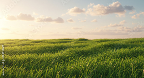 Peaceful green grass field under a serene sky brings feelings of nature and tranquility for advertising