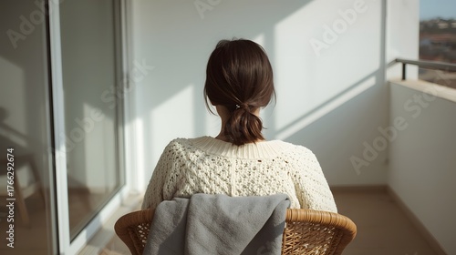 Peaceful morning scene of a woman sitting on a balcony in sunlight, wrapped in a cozy sweater and blanket, enjoying quiet solitude and minimalist comfort in a serene contemporary home setting