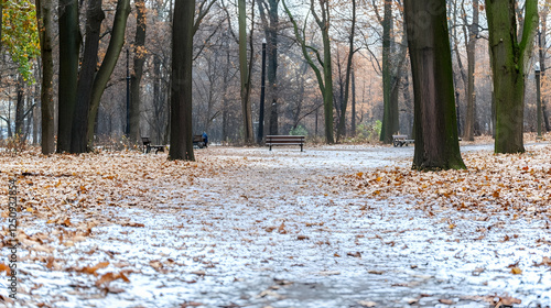 Peaceful park pathway, fall colors, gentle snow falling, for nature walks and scenic backgrounds