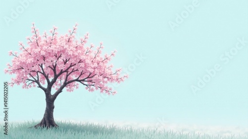 Peaceful Pink Blossom Tree on a Serene Meadow Under a Pale Sky