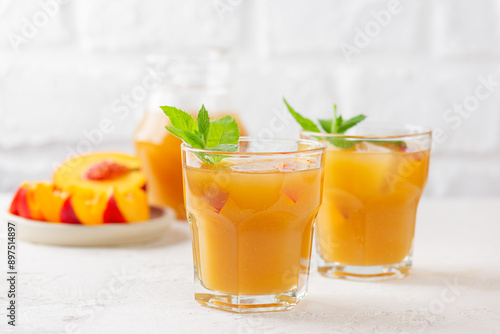 Peach and nectarine ice and mint tea on a light background. Homemade cold summer drink.