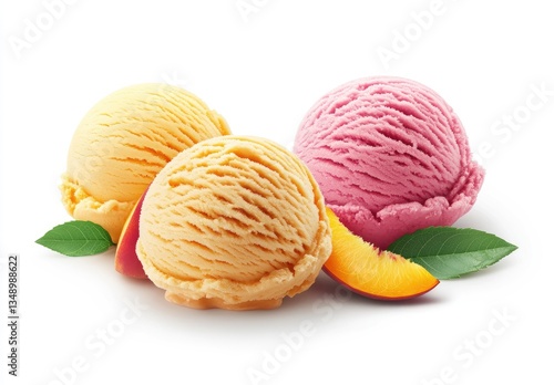 Peach and Strawberry Ice Cream Scoops on White Background with Peach Slices
