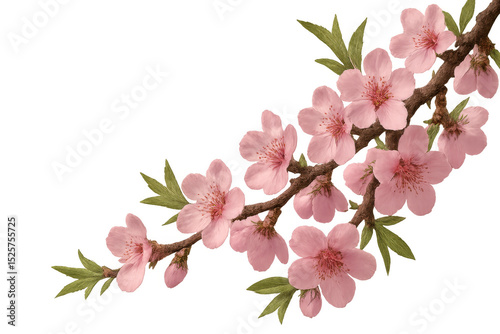 Peach tree branch with delicate pink flowers blooming, isolated on transparent background, perfect for spring designs