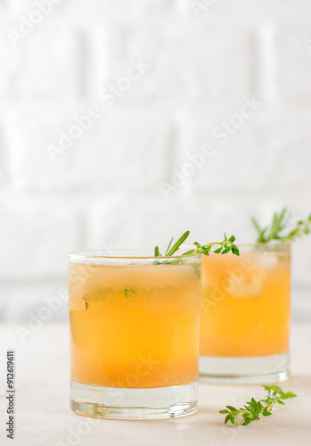Pear lemonade with rosemary, thyme and ice in a glass. Healthy drink, sugar and alcohol free. Vertical orientation.