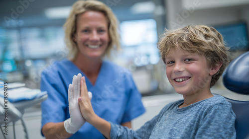 Pediatric dentist high-fives young boy after successful appointment, both smiling brightly, dental chair, sterilized tools, and fluoride station in frame