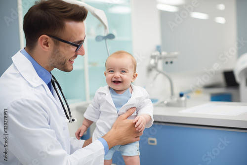 Pediatrician holds smiling toddler in well-lit clinic. Cheerful child dressed in small lab coat, creating friendly atmosphere during visit.