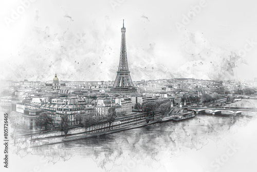 Pencil sketch illustration of Paris cityscape with the Eiffel Tower