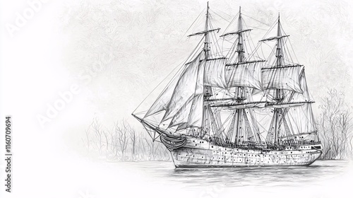 pencil sketch of an old, weathered ship in a harbor, with detailed rigging and sails. The background remains soft, leaving room for text on the bottom. [Background]:[Pencil drawing]