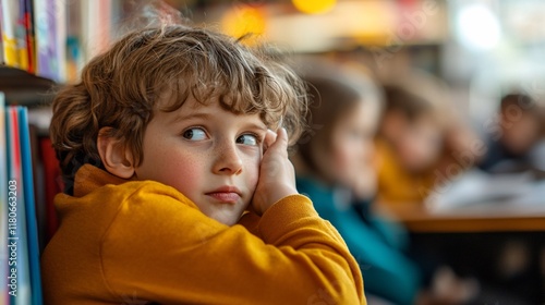 Pensive young boy leaning against bookshelves in a library, other children blurred in background.