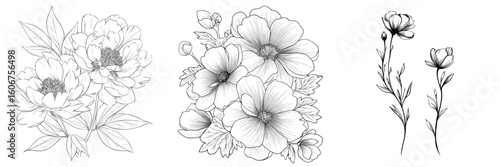 Peony flowers are outlined in a hand-drawn style, isolated on a white background, as part of a modern floral illustration