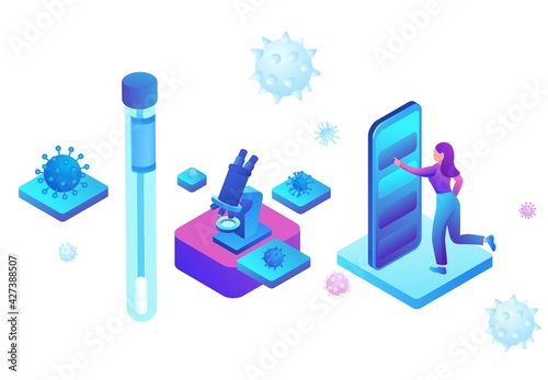 People apply for a test, Covid-19 lab, Coronavirus medical research, patient in face mask, getting tested in the laboratory, isometric vector illustration isolated on white background