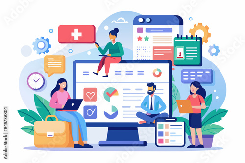 people are sitting around a computer with a monitor and a laptop, online platform for scheduling appointments and accessing medical records