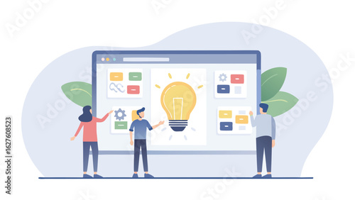 People brainstorming ideas in front of a large screen with a lightbulb and project management elements