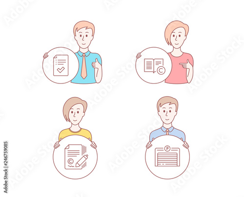 People hand drawn style. Set of Approved checklist, Copywriting and Copyright icons. Parking garage sign. Accepted message, Сopyright signature, Copywriting book. Automatic door. Vector