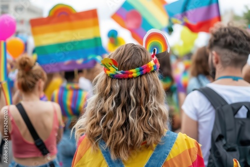 People participating in a colorful pride parade, adorned with rainbow flags, attire, and accessories, celebrating diversity and LGBTQIA+ pride.
