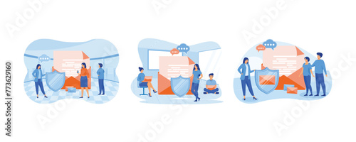 People stand near big envelope, letter, shield. Private messages, email encryption, confidential information protection. Encrypted, secure messenger concept. Set flat vector modern illustration