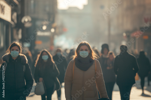 People walking through a bustling city center, each wearing a surgical mask to protect themselves from pollution and airborne particles