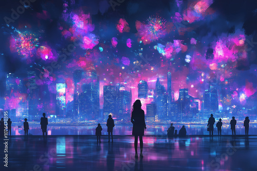 People watching a vibrant fireworks show in the night sky, with copy space. Illuminated by colorful fireworks light.