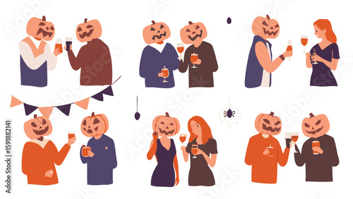 People with pumpkin heads celebrating halloween and toasting with drinks at a party scene illustration