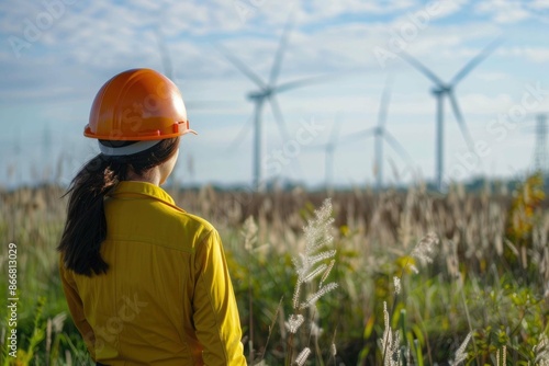 People working for alternative energy farm - Wind turbine power generators process and solar panels - Focus on helmets