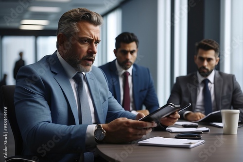 People working together in office. Businessman in office. Shot of a man using his smartphone to send an email with his colleagues in the background. Phone use in conference