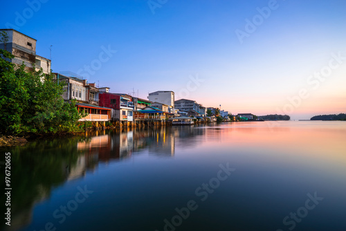 People's houses along the Bang Nara River Narathiwat Province, Thailand.
