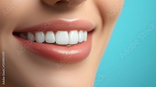 Perfect white teeth in a gentle female smile, soft natural light, vibrant blue background, emphasizing elegance, warmth, and dental health