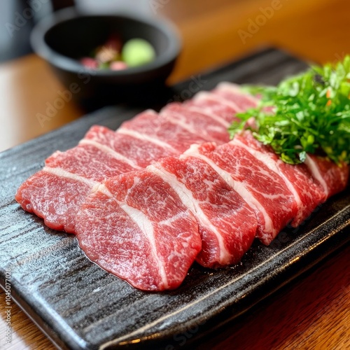 Perfectly marbled meat slices with appealing garnishes on a dark elegant plate, showcasing premium quality for the ultimate dining experience.