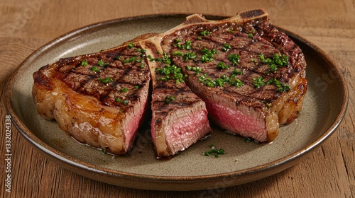 Perfectly Seared Rare T Bone Steak Sliced and Artfully Presented