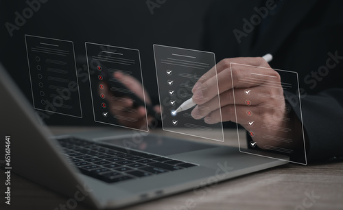 Performance checklist concept : businessman using stylus pen with laptop for questionnaire, evaluation, assessment online or survey exam and filling out for digital survey and checklist.