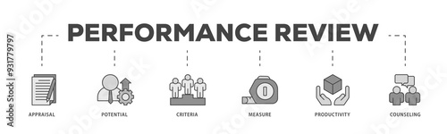 Performance review icons process structure web banner illustration of appraisal, potential, criteria, measure, productivity, and counseling icon png transparent background.