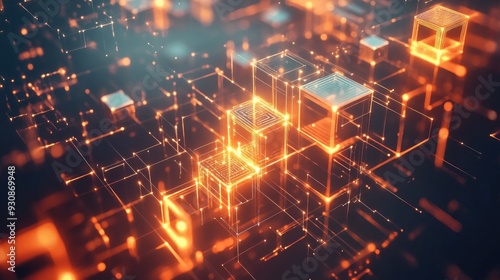 Periodic table design with minimalist 3D blocks and glowing, abstract graphics in a futuristic style.