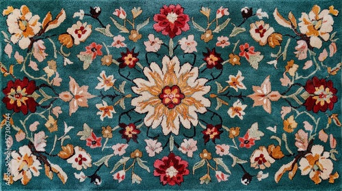 Persian-inspired carpet with intricate floral patterns on turquoise