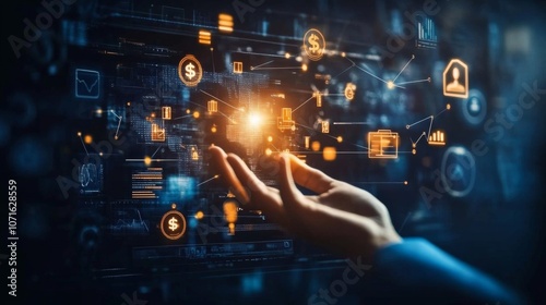 Person hand touching virtual screen futuristic interface Online banking and digital