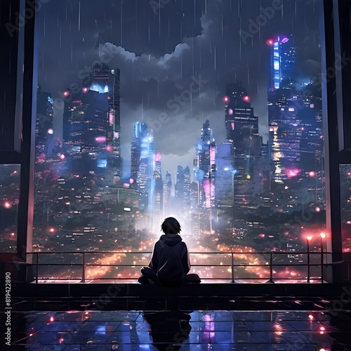 person admiring the retro futuristic world, anime styled